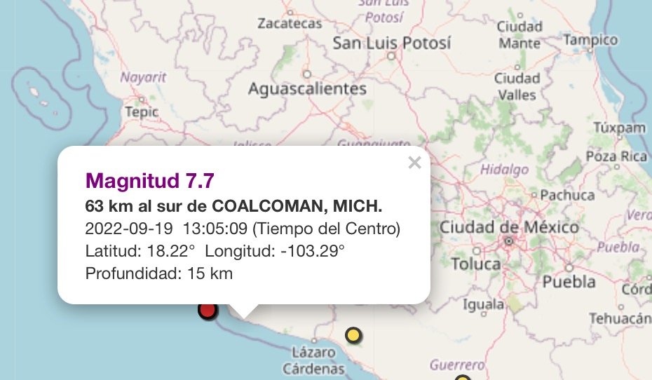 La Coordinación Estatal de Protección Civil Morelos (CEPCM) informa que el Servicio Sismológico Nacional (SSN) llevó a cabo una actualización del sismo presentado a las 13:05 horas de este lunes con epicentro a 63 kilómetros al sur de Coalcoman, en el estado de Michoacán, quedando en una magnitud de 7.7 grados.