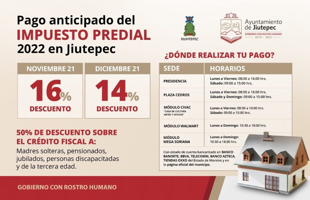 Los contribuyentes podrán realizar su pago en los módulos habilitados en el edificio que ocupa la Presidencia Municipal de Jiutepec; en el Centro Integral de Servicios de Jiutepec, ubicado en la planta alta de Plaza Cedros; en la Casa de Cultura, Artes y Oficios de Civac, asimismo en las tiendas de autoservicio Walmart y Mega Soriana.