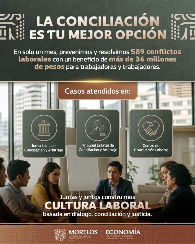 La funcionaria estatal informó que, durante la Primera Campaña de Conciliación Laboral 2025, se resolvieron 589 casos, incluidos conflictos rezagados ante la Junta Local de Conciliación y Arbitraje (JLCA), el Tribunal Estatal de Conciliación y Arbitraje (TECA) y el Centro de Conciliación Laboral del Estado de Morelos (CCLEM), sin necesidad de llegar a juicio.