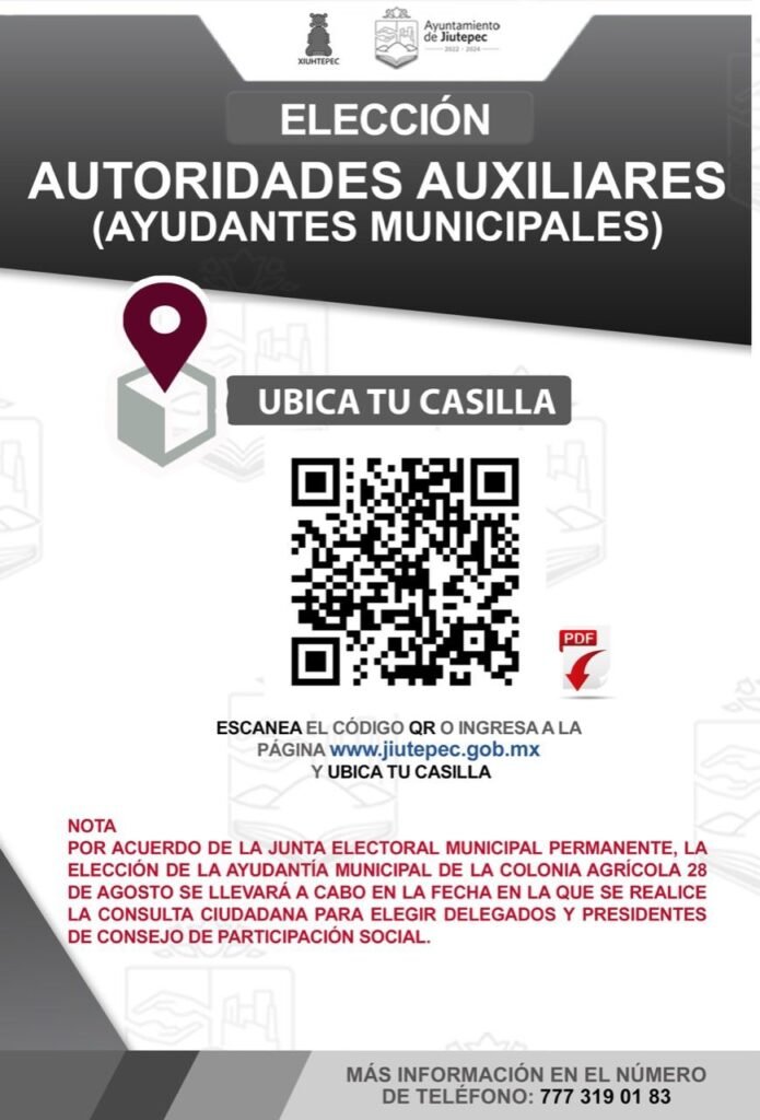 El Gobierno de Jiutepec informa a la ciudadanía con domicilio en los pueblos y las colonias: Ampliación Bugambilias, Atenatitlán, Atlacomulco, Bugambilias, Calera Chica, Cliserio Alanís, Constitución, Cuauchiles, Cuauhtémoc Cárdenas, Doctor José G. Parres, El Campanario, El Edén, El Porvenir, Huizachera, Independencia, Jardín Juárez, José López Portillo, José María Morelos y Pavón, Josefa Ortiz de Domínguez, Joya del Agua, Lázaro Cárdenas, Lomas de Jiutepec, Miguel Hidalgo, Moctezuma, Otilio Montaño, Paraíso, Pinos Jiutepec, Progreso, San Francisco Texcalpan, Tlahuapan, Villa Santiago y Vista Hermosa que este domingo 20 de marzo se realizará la elección de Ayudantes Municipales; compartimos la ubicación de las casillas que se instalarán, a partir de las 8:00 horas, en los referidos centros de población del municipio.