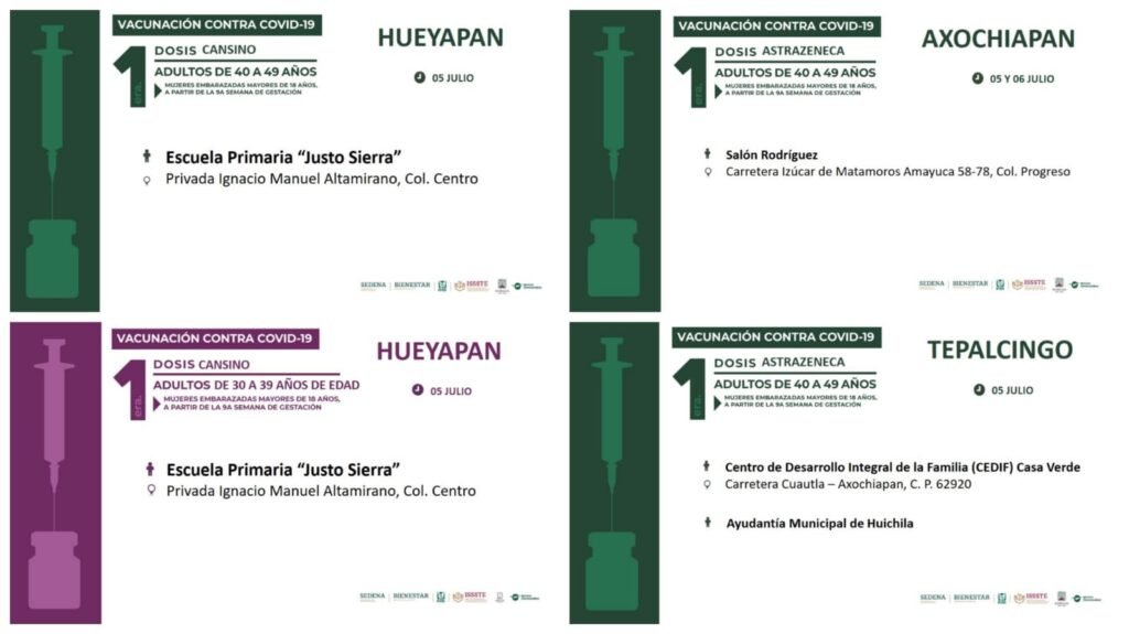 En tanto, habitantes de 40 a 49 años de Axochiapan, la inoculación será el lunes 05 y martes 06 de julio en el salón Rodríguez, ubicado en la carretera Izúcar de Matamoros, Amayuca 58-78, colonia Progreso; se aplicará vacuna AstraZeneca.