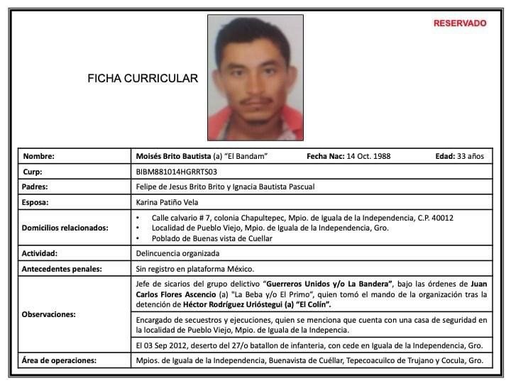 El fiscal general de Morelos, Uriel Carmona Gándara confirmó que se trata de Moisés Brito Bautista, es líder de los Guerreros Unidos y tenía una orden de aprehensión en Iguala, así como también está relacionado con el caso de los 43 normalistas desaparecidos de Ayotzinapa.
