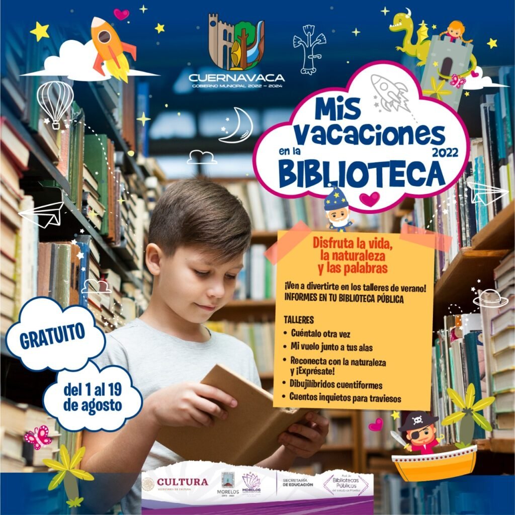 El Ayuntamiento de Cuernavaca a través de la Dirección de Administración de los Centros de Desarrollo Comunitario, Bibliotecas y Espacios Públicos, adscrita a la Secretaría de Desarrollo Humano y Participación Social, invita a niñas y niños a participar en el curso de verano “Mis vacaciones en la biblioteca 2022”, que se llevará a cabo a partir del lunes 01 al viernes 19 de agosto totalmente gratuito en distintas bibliotecas públicas del municipio.