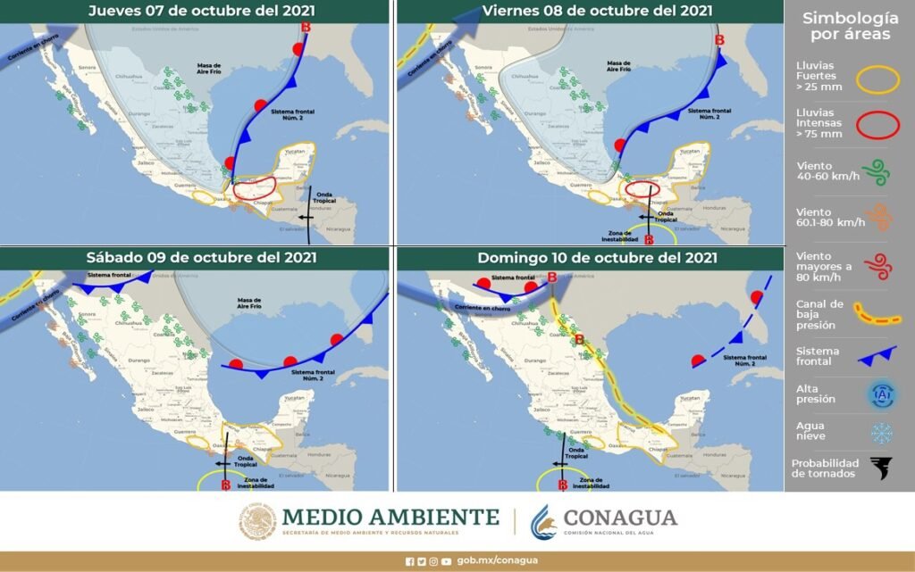 Finalmente, para el domingo próximo continuará dominando el sistema de alta presión sobre el país, lo que favorece tiempo estable y bajo contenido de humedad en la mayor parte del mismo, con excepción en estados de la costa sur, donde se prevé relativa inestabilidad.