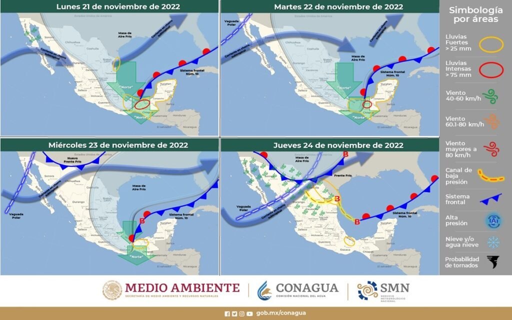 A partir del miércoles, debido a un sistema de alta presión que empezará a dominar sobre gran parte del territorio nacional, se espera tiempo más estable, con ambiente matutino frío y bajo potencial para lluvias; no obstante, en estados del sureste, aún prevalecerán condiciones inestables.