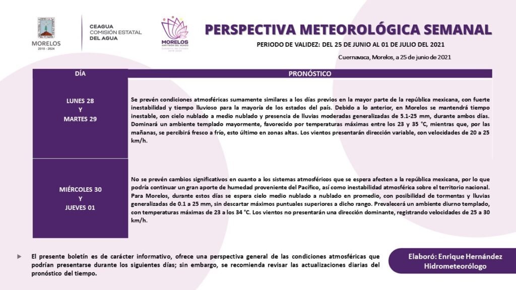 En cuanto al miércoles y jueves, en Morelos, se espera cielo medio nublado a nublado en promedio, con posibilidad de tormentas y lluvias generalizadas de 0.1 a 25 mm, sin descartar máximos puntuales superiores a dicho rango. Prevalecerá un ambiente diurno templado, con temperaturas máximas de 23 a los 34 °C. Los vientos no presentarán una dirección dominante, registrando velocidades de 25 a 30 km/h.