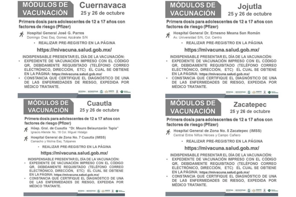 En Zacatapec, la vacunación de primeras dosis de adolescentes de 12 a 17 años con factores de riesgo de cualquier municipio se realizará este lunes 25 y martes 26 de octubre a partir de las 10:00 a.m. y hasta concluir las dosis asignadas en: