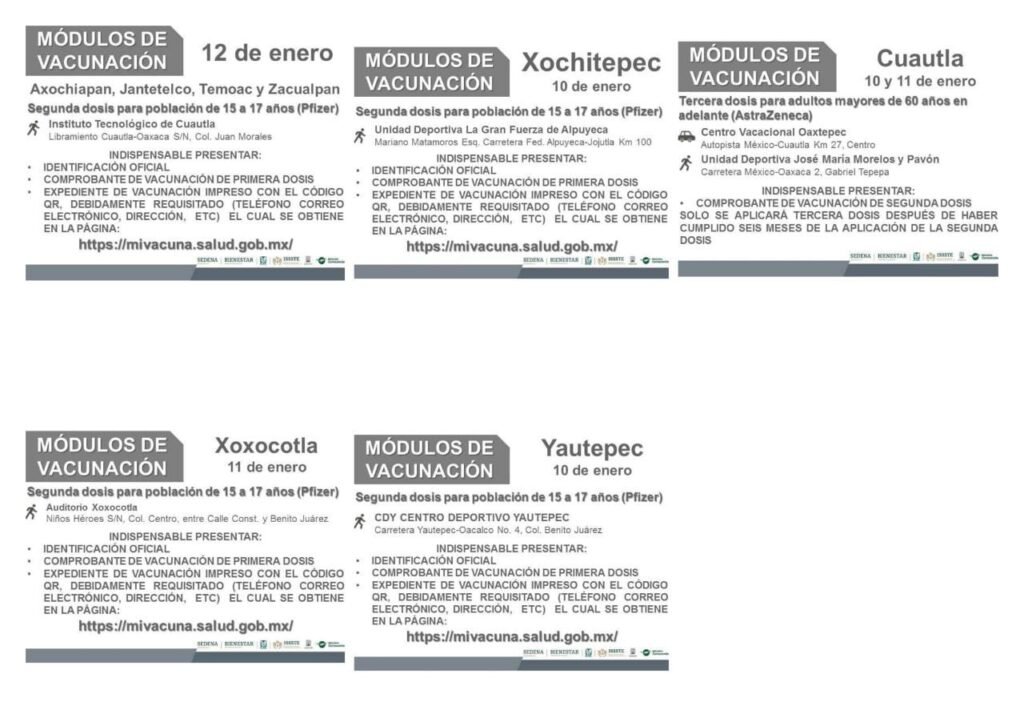 Por su parte, la población de 15 a 17 años de los municipios de Axochiapan, Jantetelco, Temoac y Zacualpan, podrán recibir su segunda dosis de Pfizer el miércoles 12 de enero a partir de las 9:00 horas y hasta agotar las dosis asignadas en: