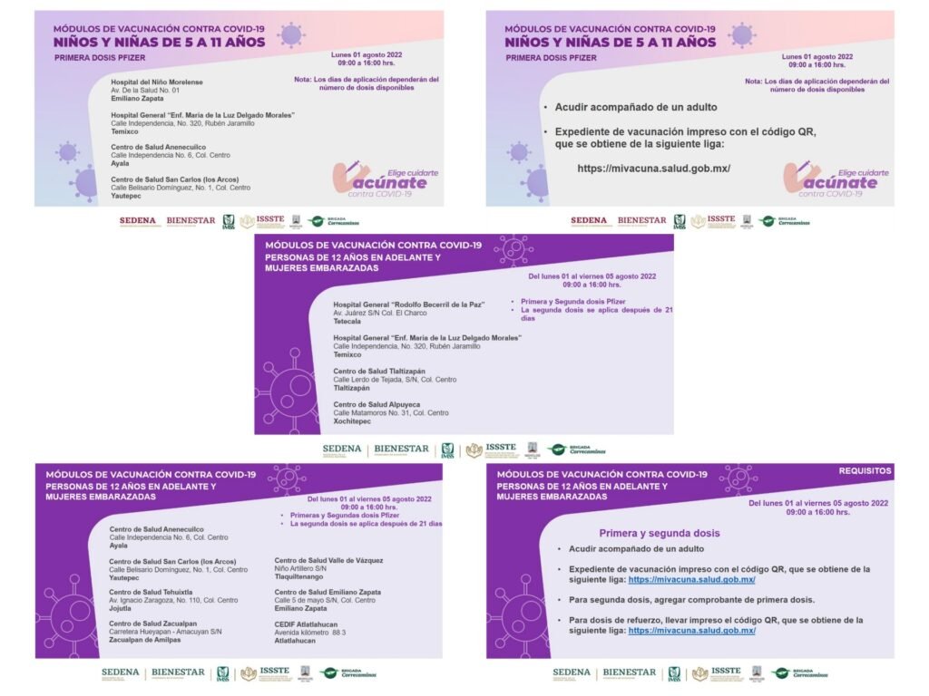 Al hacer el llamado, ¡Elige cuidarte, vacúnate contra COVID-19!, autoridades federales y estatales pidieron a los padres de familia llevar a sus hijos de 5 a 11 años a recibir la primera dosis Pfizer en los puntos activos, el lunes 01 de agosto del 2022, de 09:00 a 16:00 horas, y los días de aplicación dependerán del número de vacunas disponibles.