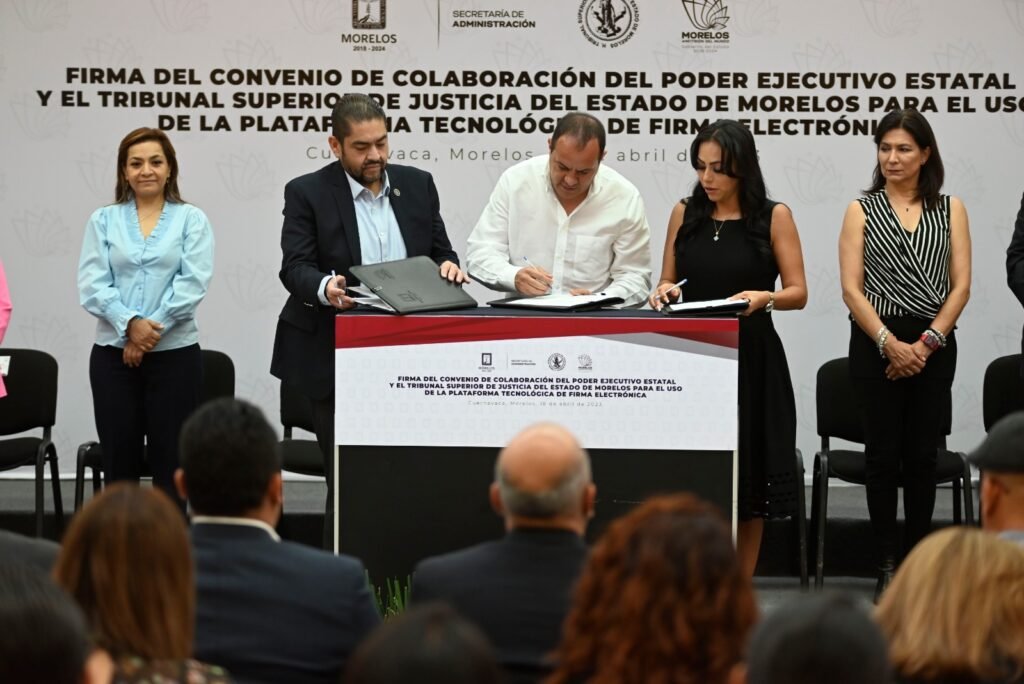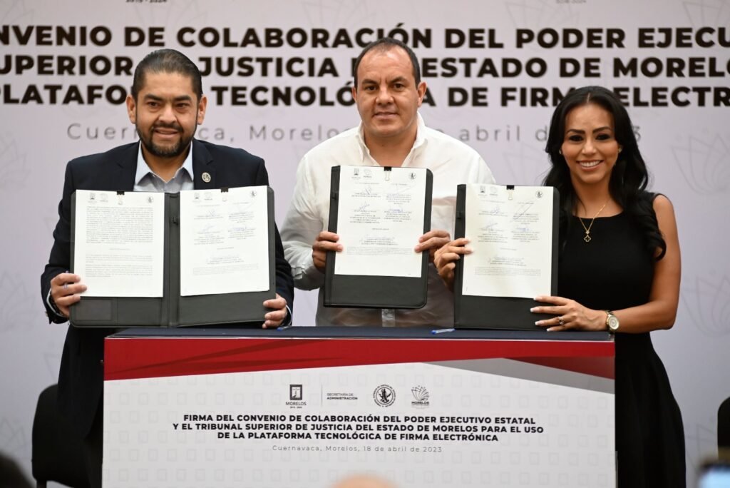 Este medio día, el Gobierno que encabeza Cuauhtémoc Blanco Bravo refrendó su compromiso de trabajar de manera conjunta con los demás Poderes del Estado, al formalizar la signa de un convenio de colaboración con autoridades del Tribunal Superior de Justicia (TSJ), para el uso de la plataforma tecnológica de Firma Electrónica, poniendo a Morelos a la vanguardia a nivel nacional.