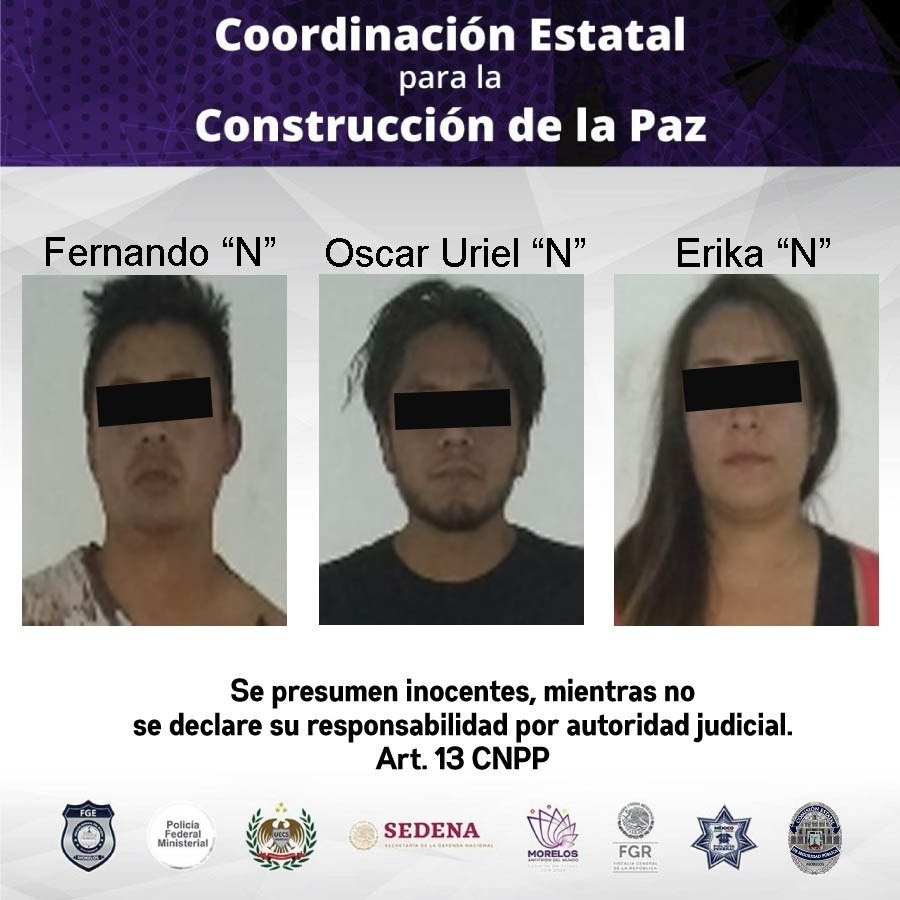 Los detenidos son Fernando “N”, de 29 años de edad; Oscar Uriel “N” y Erika “N”, ambos de 28 años de edad, quienes fueron presentados ante el agente del Ministerio Público, el cual determinará su situación jurídica.
