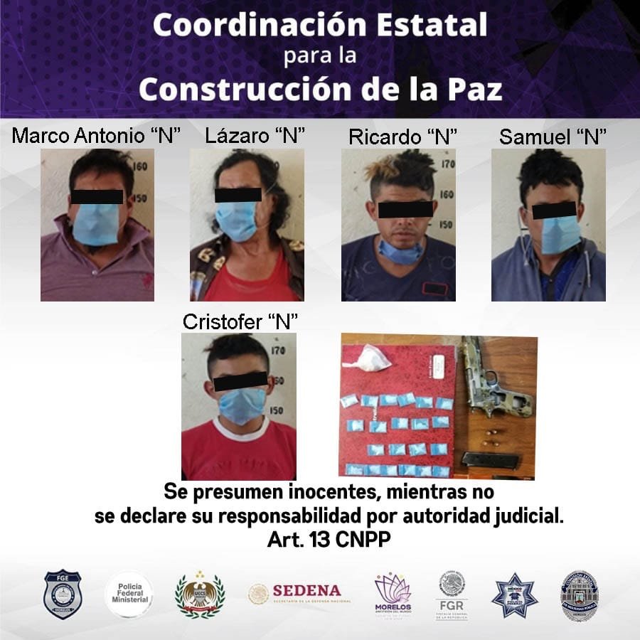 A través del diálogo con los pobladores, les fueron entregados los cinco masculinos a los elementos de la Policía Morelos, y al realizarles una revisión se aseguró una bolsa con una sustancia sólida de color blanco similar a la cocaína, varias bolsitas de plástico tipo ziploc de color azul, que contenían una sustancia granulada con características similares a la droga conocida como cristal; asimismo, al realizar una inspección al vehículo localizaron adentro un arma de fuego tipo pistola, con un cargador metálico abastecido con varios cartuchos útiles.