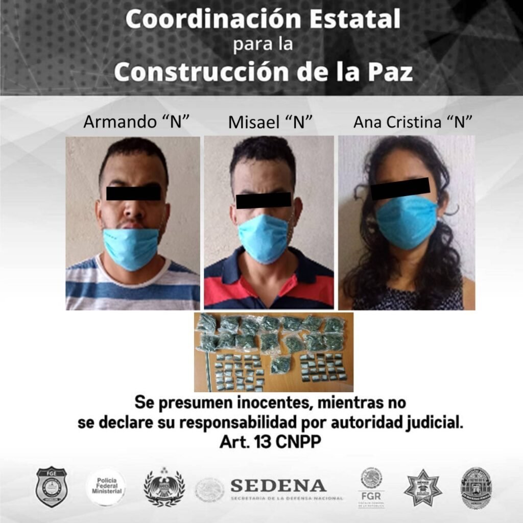 Por lo anterior, fueron detenidos Armando “N”, de 32 años; Misael “N”, de 39 años; y Ana Cristina “N”, de 22 años; quienes fueron presentados ante el agente del Ministerio Público del Fuero Común, el cual determinará su situación jurídica.