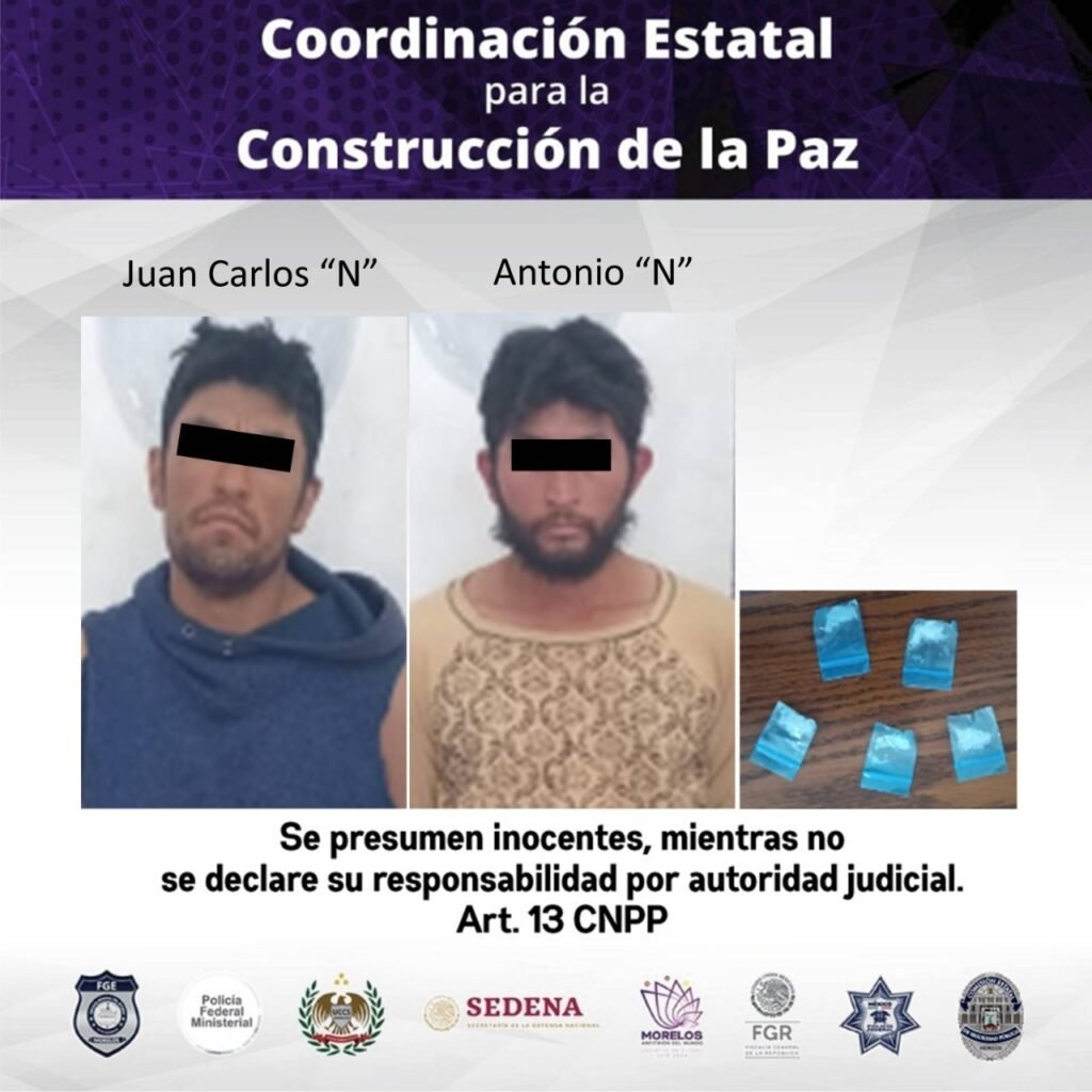 Mediante el señalamiento directo de la parte afectada, los elementos de la Policía Morelos detuvieron a quien dijo llamarse Juan Carlos “N”, de 28 años, y Antonio “N”, de 29 años, a los cuales aseguraron varios objetos robados y bolsitas de plástico que contenían una sustancia sólida con características de la droga conocida como cristal.