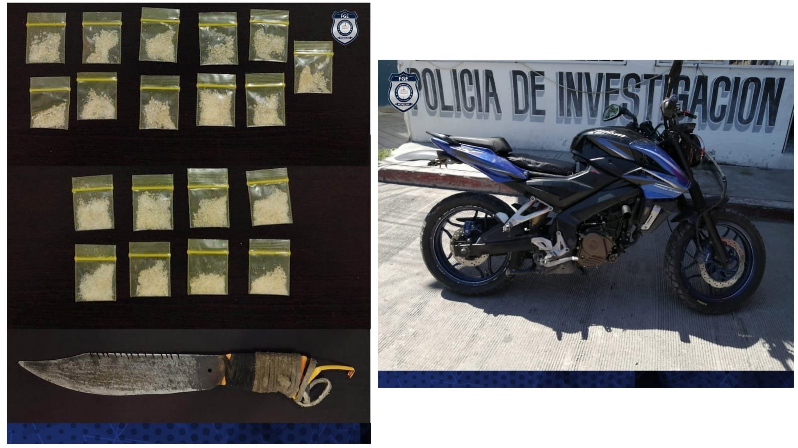 En la inspección, los investigadores encontraron a Paola Getzemany “N”, de 27 años de edad, y a Agustín Audón “N”, de 25 años, en posesión de 19 dosis de la droga conocida como cristal, las cuales fueron aseguradas, así como la motocicleta marca Bajaj, tipo Pulsar, color azul con negro, modelo 2017, sin placas de circulación.