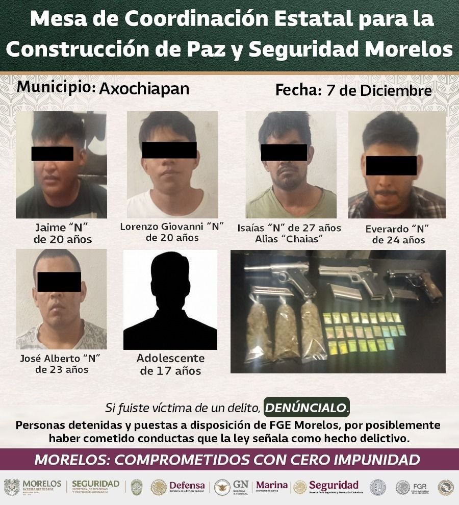 Gracias a una denuncia ciudadana fueron asegurados en Tepoztlán Fernando “N” de 55 años, Freddy “N” de 18 años, Kevin Manuel “N” de 24 años, Emmanuel “N” de 36 años, Marco Aurelio “N” de 38 años y un adolescente de 14 años, quienes portaban un inhibidor de señal con ocho antenas (Jammer), así como varias bolsas de plástico que contienen sustancia similar al “cristal”, un cargador metálico negro que contiene 10 cartuchos útiles, cuatro teléfonos celulares, y un vehículo Nissan Rogue gris, con permiso de circulación del estado de Guerrero.
