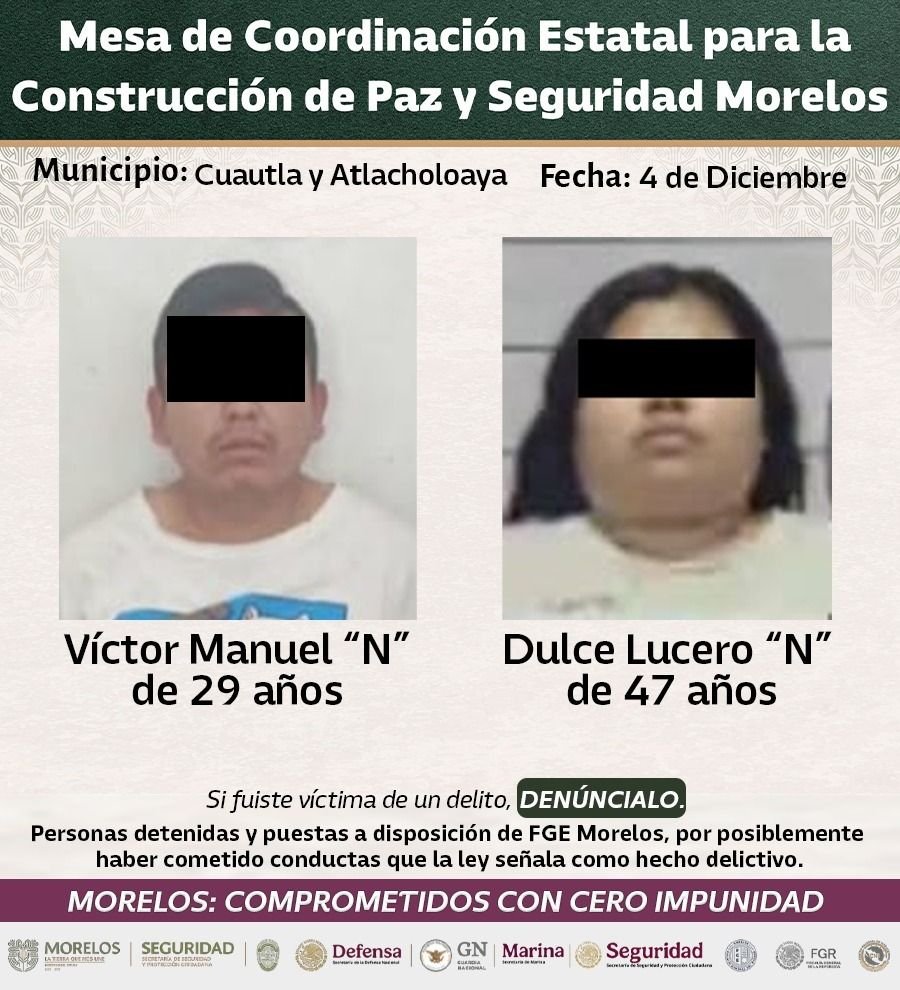 En ese sentido, Urrutia Lozano detalló que, en continuidad con la Estrategia Nacional Contra la Extorsión, Operativo “Cuautla Segura”, se cumplimentaron dos Ordenes de Aprehensión en Reclusión por el delito de Extorsión Agravada, en contra de Víctor Manuel “N” de 29 años y Dulce Lucero “N” de 47 años.