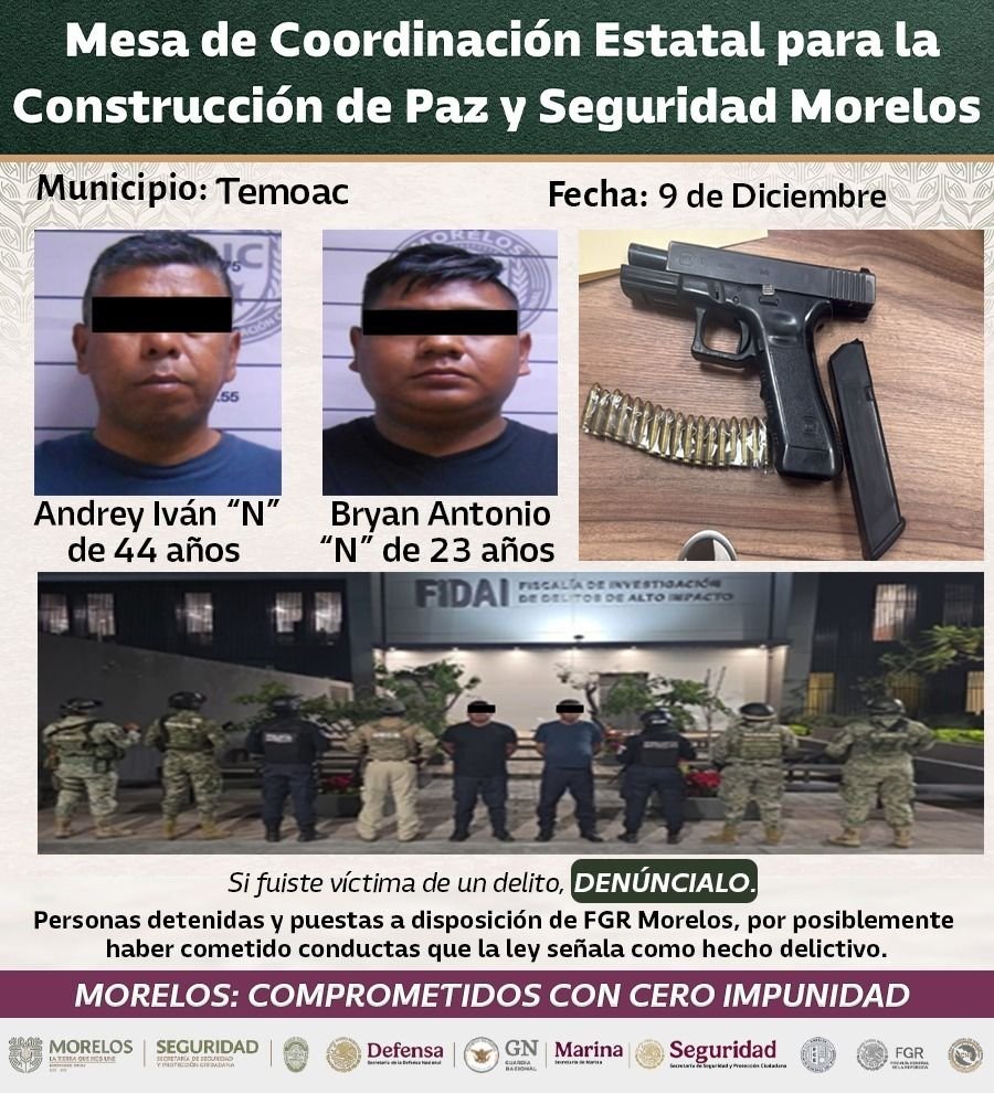 También informó que derivado del operativo “Tecatl y/o Vigilante” contra robo de vehículos y motocicletas en la Zona Metropolitana, detuvieron en flagrancia Luis Alexis “N” 32 años quien momentos antes había cometido el robo con violencia de una camioneta Volkswagen Tiguan, modelo 2025, con placas de circulación del Estado de Morelos en la colonia Teopanzolco en Cuernavaca.