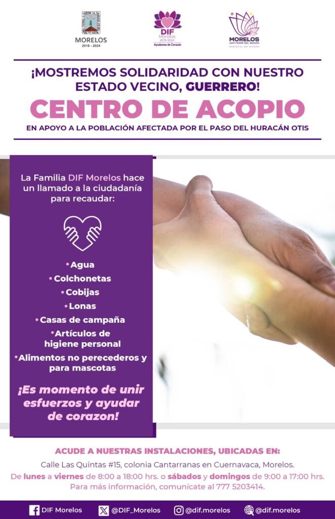 El Sistema DIF (SEDIF) Morelos invita a la ciudadanía a sumarse a la campaña para recaudar artículos y alimentos a través de su centro de acopio, en solidaridad a las personas que han resultado afectadas por el huracán Otis, causante de grandes afectaciones en Guerrero.