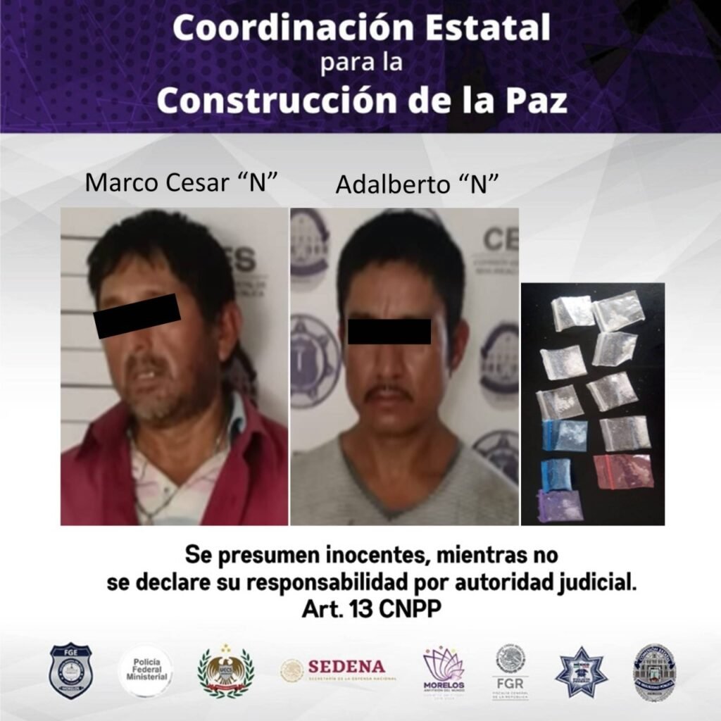 Ante la denuncia, los elementos de la Policía Morelos comenzaron la búsqueda de los sujetos, fue metros adelante que tuvieron a la vista a dos hombres con las características antes descritas y al realizar una inspección fueron aseguradas varias bolsitas de plásticas tipo ziploc, que contenían una sustancia granulada con las características similares a la droga conocida como cristal.