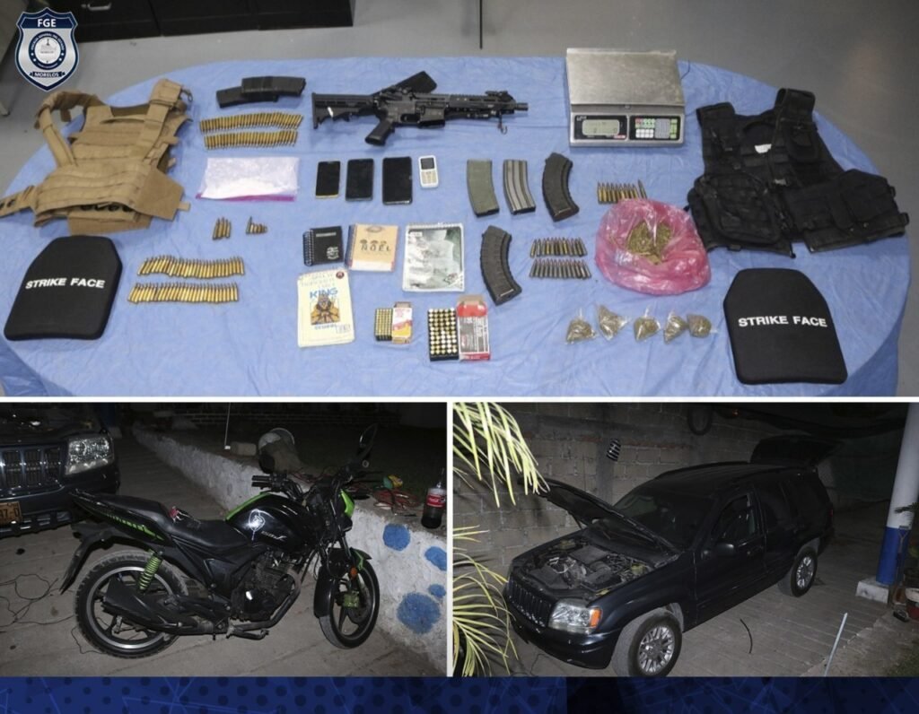 Se incautaron cargadores abastecidos, un arma de fuego, drogas, cartuchos, teléfonos celulares y dos vehículos