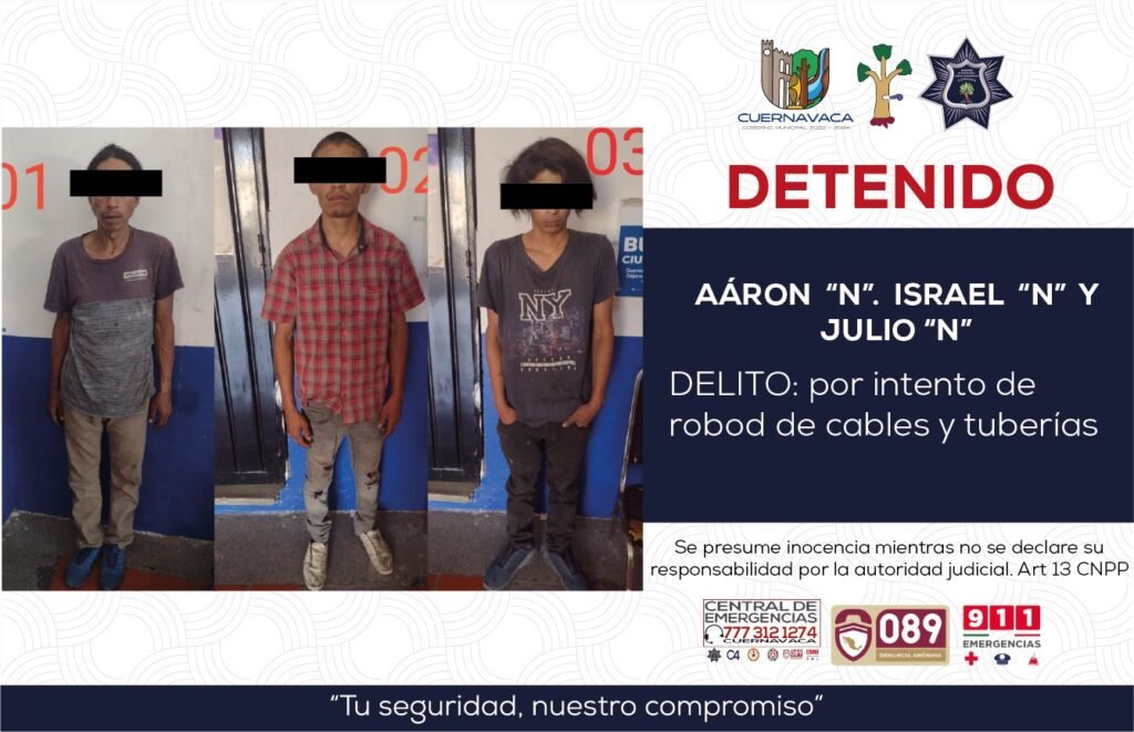 Y finalmente, el domingo 26 de marzo detuvieron y pusieron a disposición en la colonia Santa María a Aarón “N”, Israel “N” y Julio “N” por intento de robo de cables y tuberías en la ciudad.