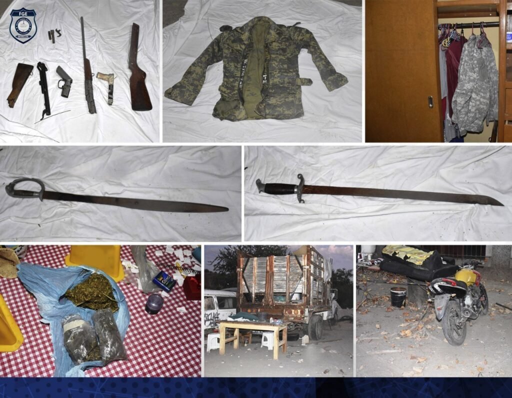 Además de los vehículos, así como motores, cuadros de motocicletas y autopartes, los agentes investigadores aseguraron dos armas largas, 14 cartuchos de distintos calibres, envoltorios con hierba similar a la marihuana, ropa camuflada, identificaciones personales, cuchillos y un machete.