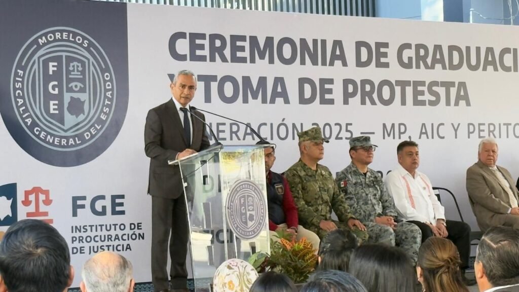 En la ceremonia de graduación de la Generación 2025, integrada por 20 Agentes del Ministerio Público, 20 Agentes de Investigación Criminal y 25 Peritos, encabezada por la jefa del Ejecutivo, Fernando Blumenkron Escobar exhortó a los nuevos elementos a asumir una responsabilidad ética, profesional y social con Morelos y con la ciudadanía.