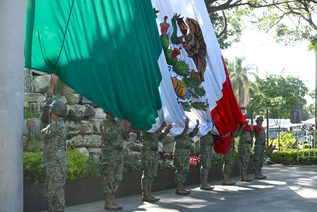 Durante la ceremonia, destacó que la bandera mexicana es resultado de un proceso histórico que sintetiza identidad, soberanía y los valores del humanismo mexicano que guían la transformación del país.