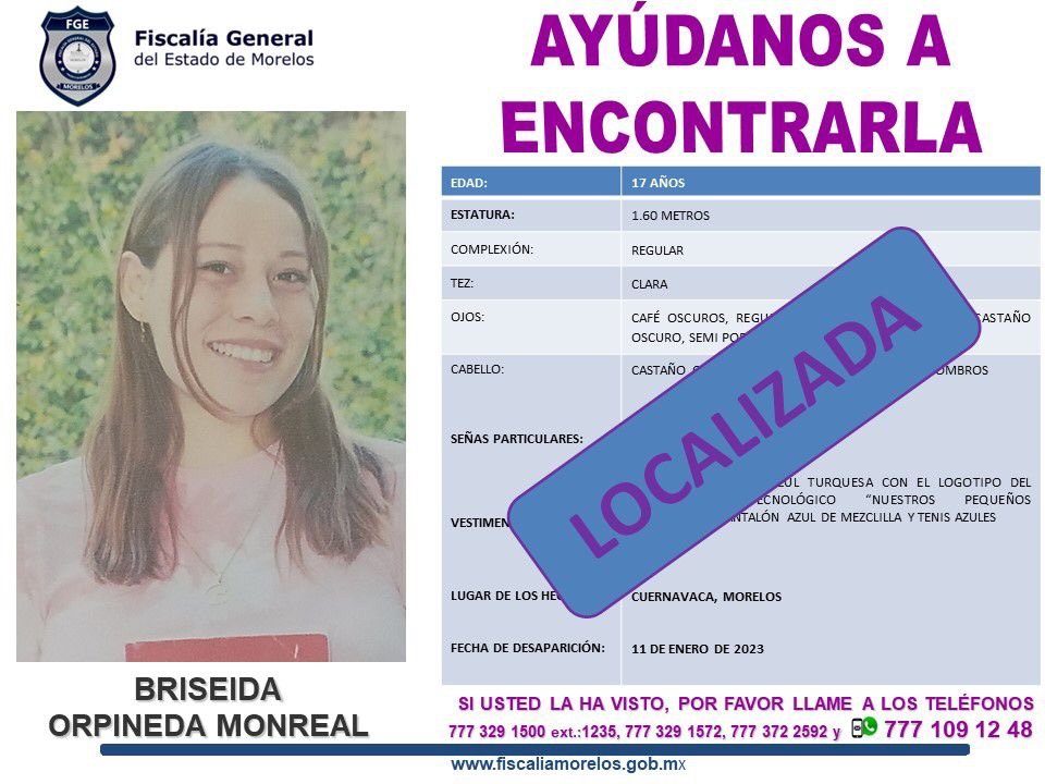 Ante el Ministerio Público se inició la denuncia por la no localización de una adolescente de 17 años de edad, quien habría sido vista por última vez el 11 de enero del presente año al salir de una institución educativa en la colonia Buenavista, en el municipio de Cuernavaca.
