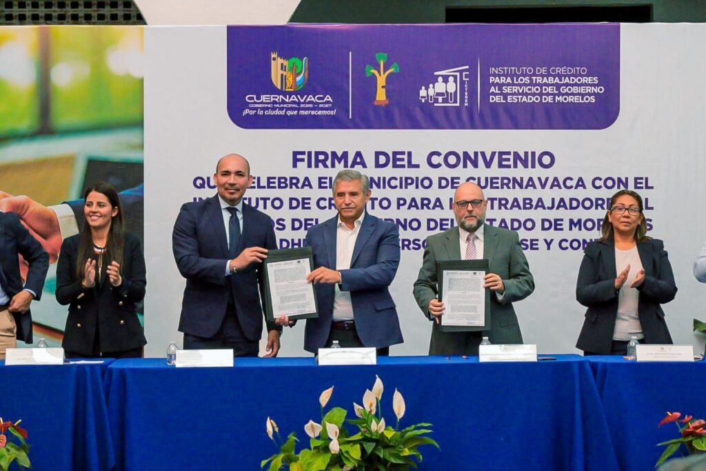 Como resultado de una política pública orientada a la protección de los derechos laborales y al fortalecimiento del bienestar social, el Ayuntamiento de Cuernavaca, encabezado por el alcalde José Luis Urióstegui Salgado, firmó este jueves un convenio que permitirá que, a partir del 01 de enero de 2026, la totalidad del personal municipal quede incorporada al Instituto de Crédito para los Trabajadores al Servicio del Gobierno del Estado de Morelos (ICTSGEM), al adherir a personal de confianza y de base.