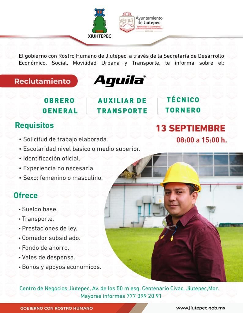 Este martes 13 de septiembre, entre las 8:00 y las 15:00 horas, tendrá lugar un reclutamiento masivo en el Centro de Negocios de Jiutepec (Parque Venus de la colonia Civac) en donde se ofertarán 50 posiciones de obrero en general, dos de técnicos torneros y tres auxiliares de transporte; los empleos tienen sede laboral en el estado de Morelos.