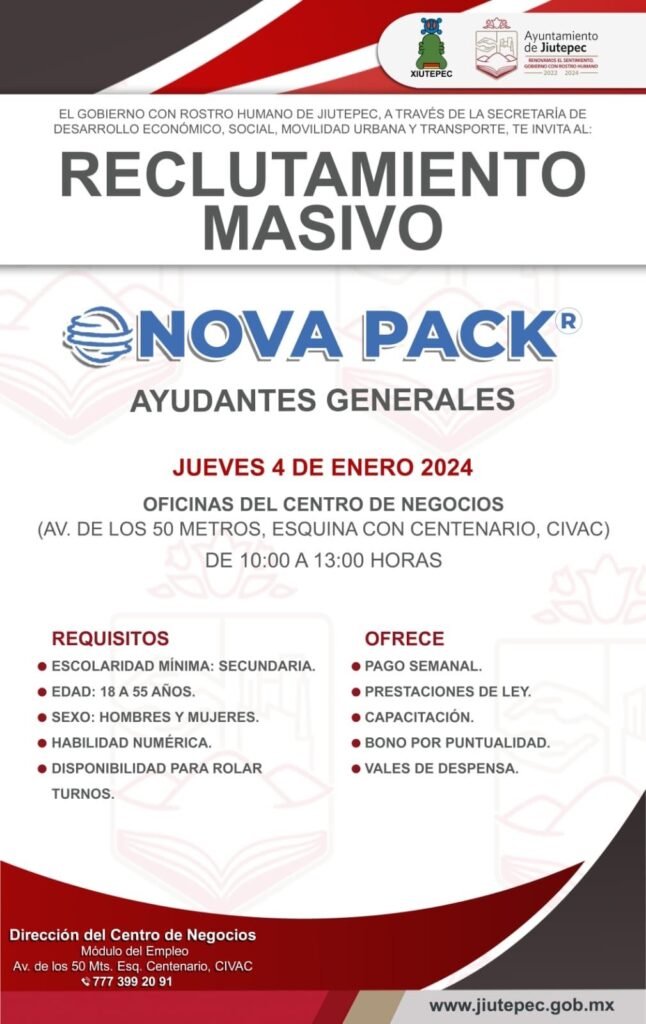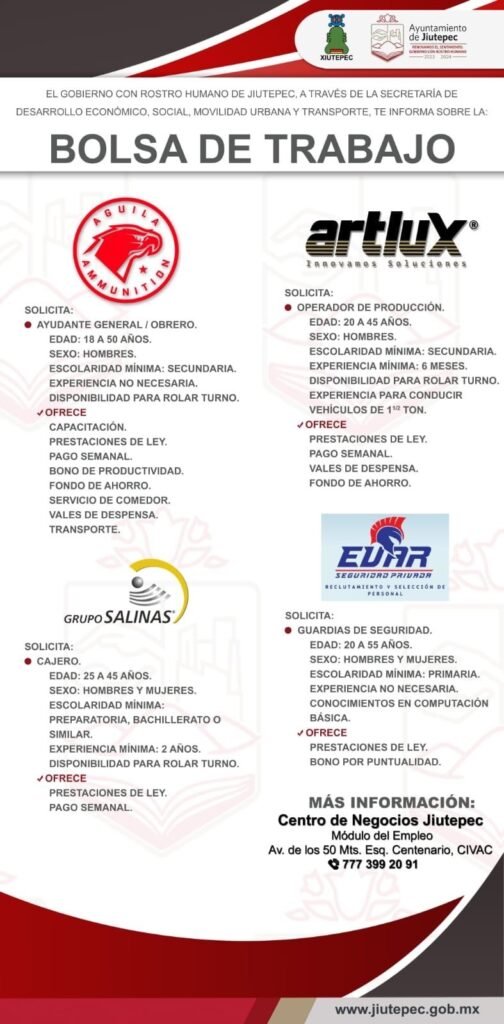 Por otra parte, semanalmente a través de las cuentas en redes sociales (Facebook, X, Instagram y WhatsApp), así como la página web del Gobierno de Jiutepec se publicita una bolsa de trabajo sobre los empleos formales que oferta la iniciativa privada, así como dependencias gubernamentales de los diferentes niveles.