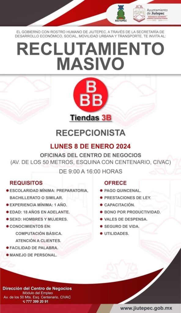 El jueves cuatro, el lunes ocho y el martes nueve de enero tendrán lugar en el Centro de Negocios de Jiutepec, oficina ubicada al interior de la Secretaría de Desarrollo Económico, procesos de reclutamiento para ocupar plazas de ayudantes en general, gerente de tienda, recepcionista, así como asesores de venta, respectivamente.