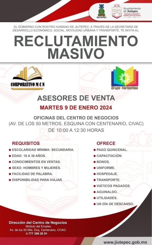 El jueves cuatro, el lunes ocho y el martes nueve de enero tendrán lugar en el Centro de Negocios de Jiutepec, oficina ubicada al interior de la Secretaría de Desarrollo Económico, procesos de reclutamiento para ocupar plazas de ayudantes en general, gerente de tienda, recepcionista, así como asesores de venta, respectivamente.