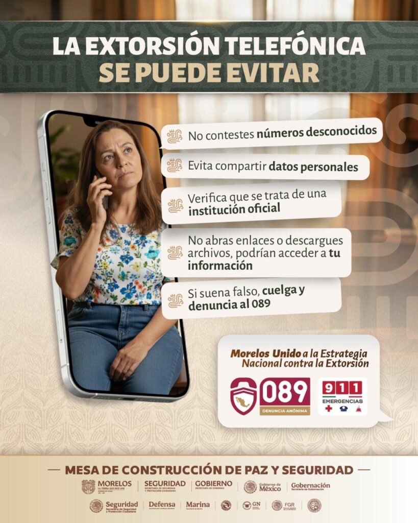 Como parte de la Estrategia Nacional contra la Extorsión impulsada por el Gobierno de México, los integrantes de la Mesa de Coordinación Estatal para la Construcción de Paz y Seguridad en el Estado de Morelos, con el respaldo del Gobierno que dirige Margarita González Saravia, pusieron en marcha la primera campaña estatal para prevenir los diferentes tipos penales de extorsión, informó el titular de la Secretaría de Seguridad y Protección Ciudadana (SSPC), Miguel Ángel Urrutia Lozano.