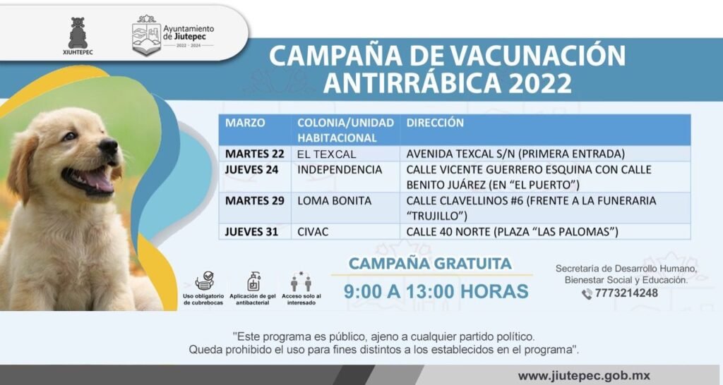 El Gobierno de Jiutepec, a través de la Dirección de Salud Pública, inicia este martes 22 de marzo con la campaña gratuita de vacunación antirrábica para animales de compañía (perros y gatos) del municipio.