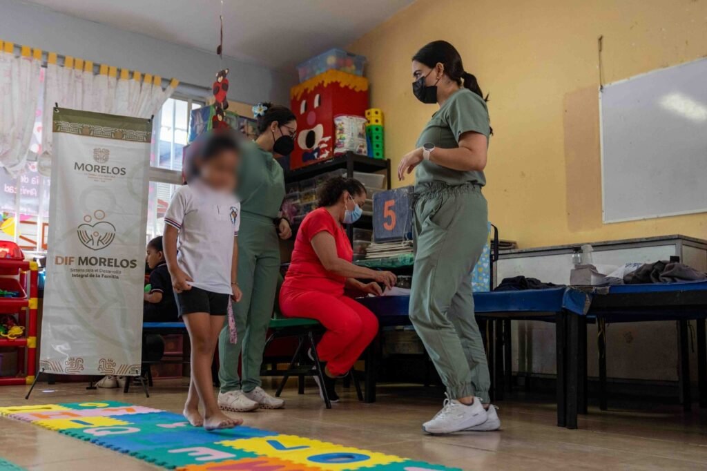 Durante la primera jornada llevada a cabo en el Jardín de Niños República de Venezuela, en el municipio de Temixco, el equipo de terapia física, comunicación humana, odontología y trabajo social del Centro de Rehabilitación y Educación Especial (CREE) Morelos, realizó la valoración postural, de la marcha y el equilibrio, análisis de huella plantar, detección de problemas del habla, revisión de caries, entre otras, a 52 alumnas y alumnos.