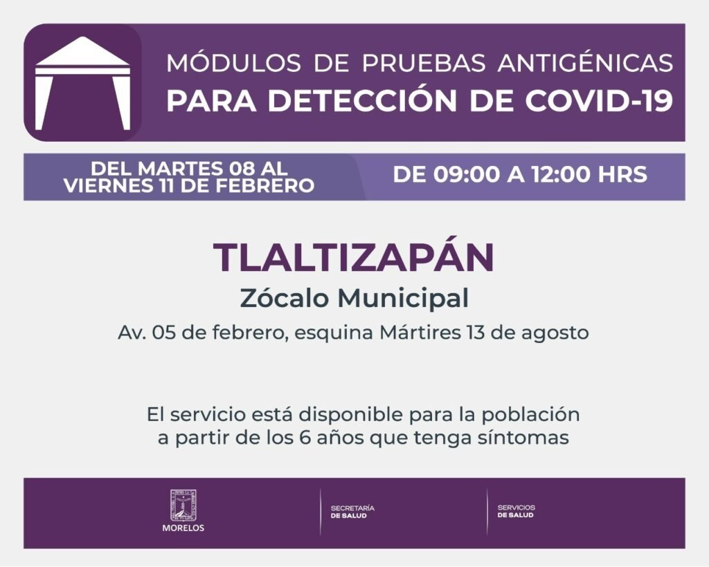 El Gobierno estatal, a través de la Secretaría de Salud y Servicios de Salud de Morelos (SSM), informó que del 08 al 11 de febrero, las brigadas sanitarias realizarán pruebas de antígeno para la detección de COVID-19 en los municipios de Tlaltizapán, Huitzilac y Zacualpan de Amilpas.
