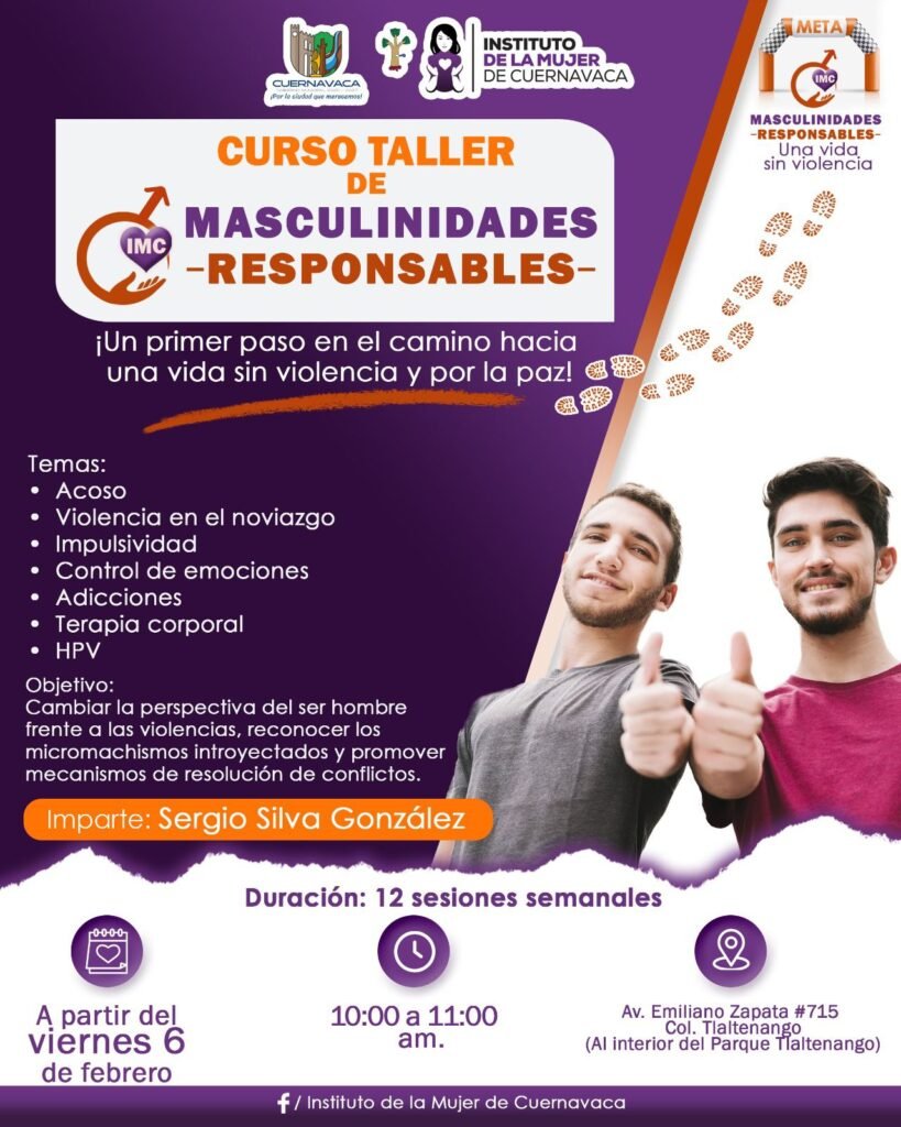 Como parte de estas acciones, la campaña arrancará con el Curso-Taller Masculinidades Responsables: ¡Un primer paso en el camino hacia una vida sin violencia y por la paz!, impartido por Sergio Silva González, cuyo objetivo es generar un cambio en la perspectiva del ser hombre frente a las violencias, reconocer los micromachismos introyectados y promover mecanismos adecuados para la resolución pacífica de conflictos.