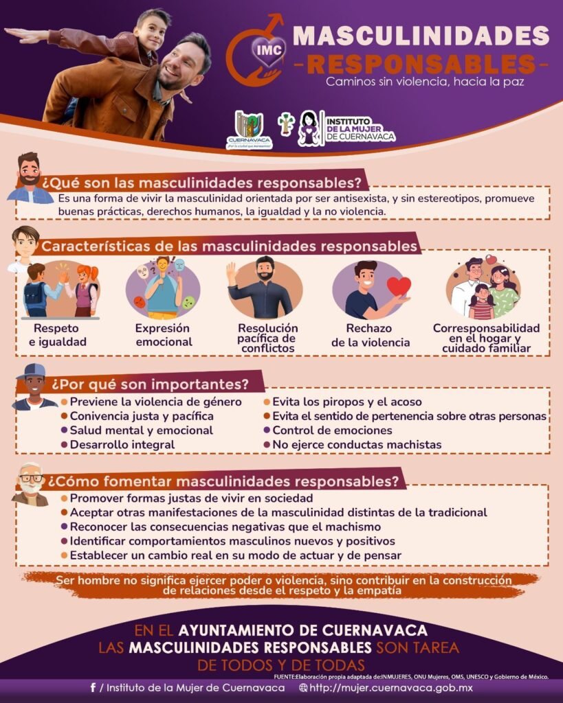Con el objetivo de fortalecer la construcción de relaciones basadas en el respeto, la igualdad y el bienestar entre hombres y mujeres, el Instituto de la Mujer de Cuernavaca (IMC) intensifica su campaña de Masculinidades Responsables, basada en el criterio de que ser hombre no significa ejercer poder o violencia, sino contribuir a la construcción de relaciones de respeto y empatía.