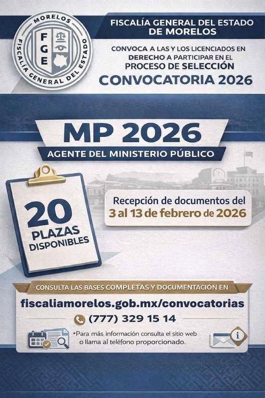 La Fiscalía General del Estado (FGE) de Morelos invita a licenciadas y licenciados en derecho que estén interesados en desarrollarse como agentes del Ministerio Público a participar en la convocatoria para MP 2026.