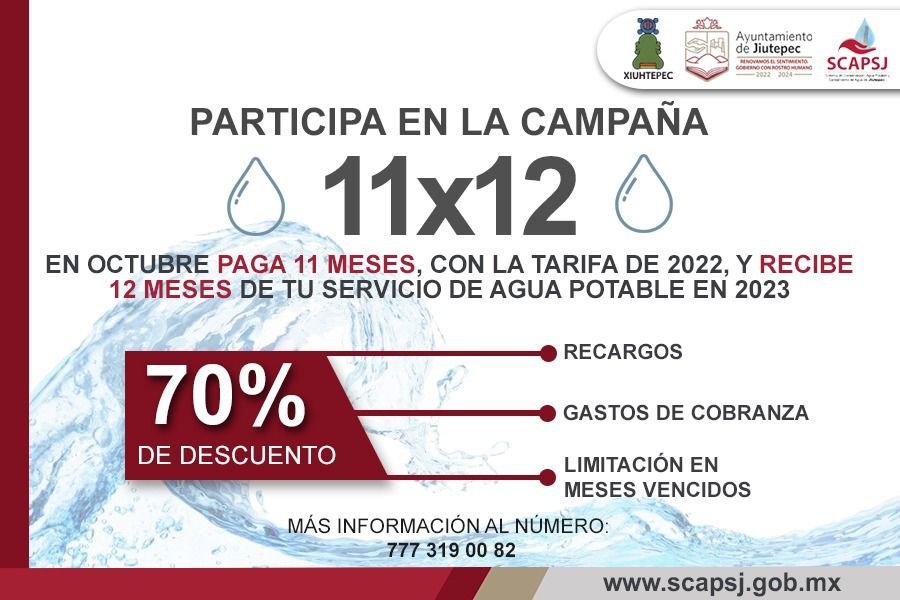 1.-A partir del próximo sábado uno de octubre y hasta el sábado 31 de diciembre del presente año tendrá vigencia la campaña 11×12. Las y los usuarios de tomas habitaciones y residenciales podrán pagar 11 meses de servicio de agua potable, con la tarifa de 2022, y en el año 2023 recibirán 12 meses del servicio.