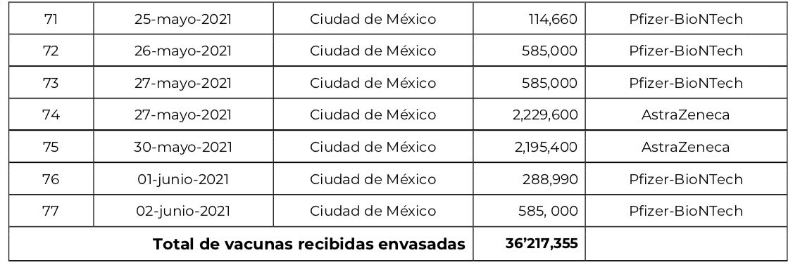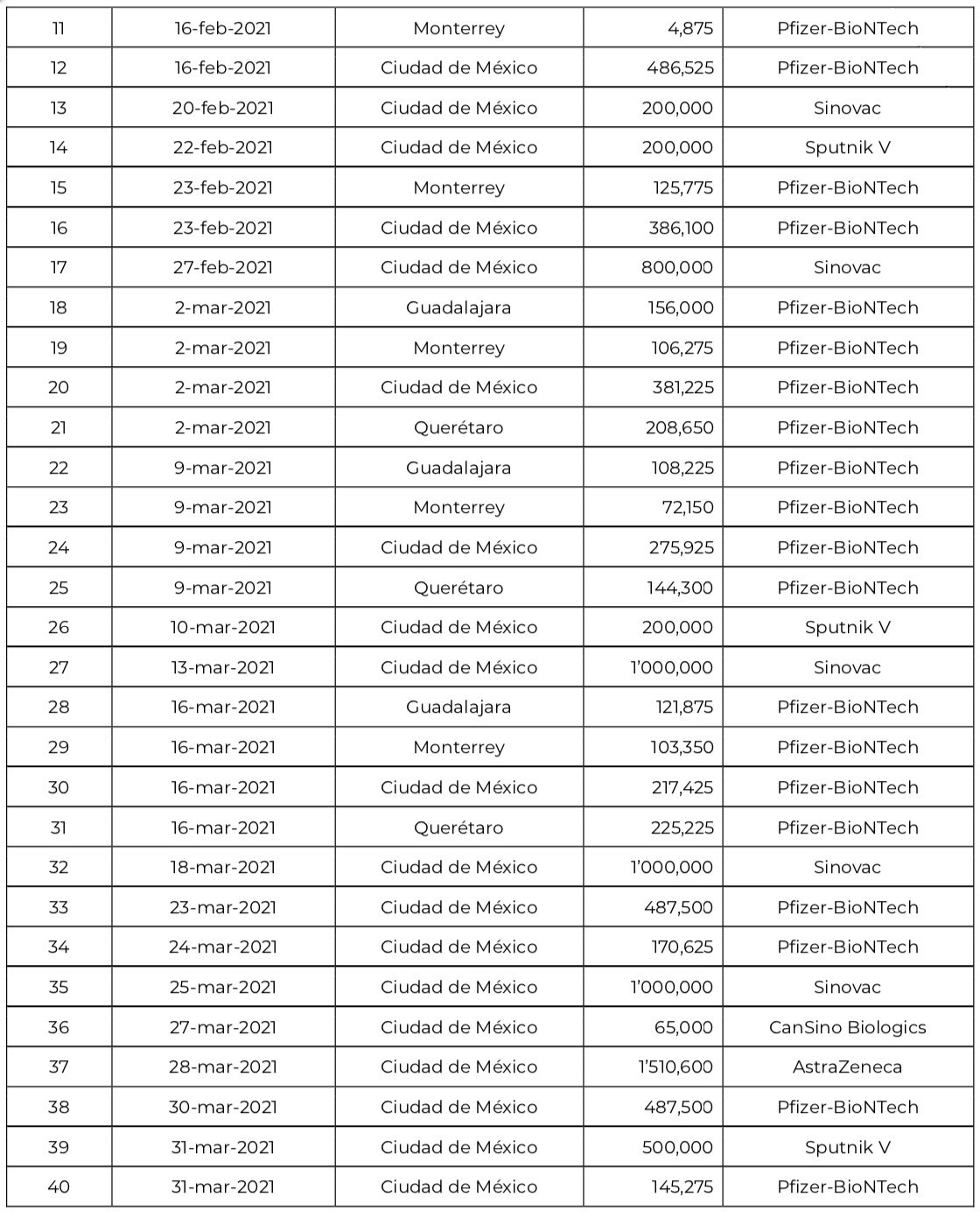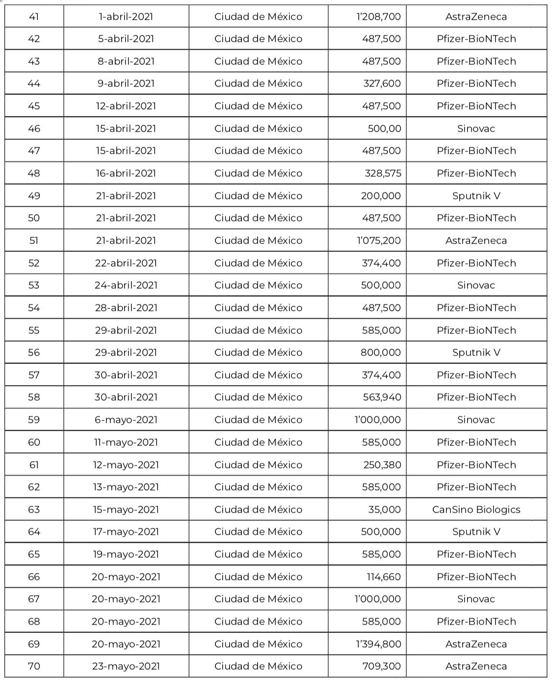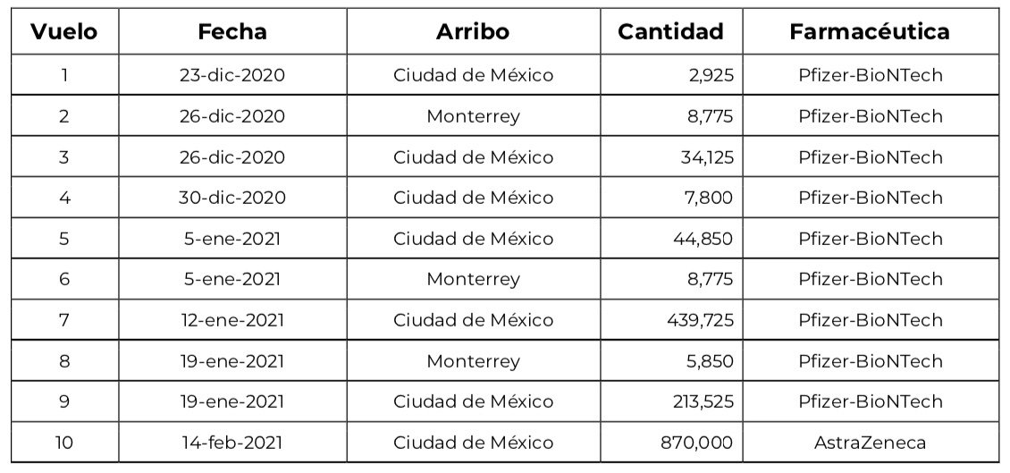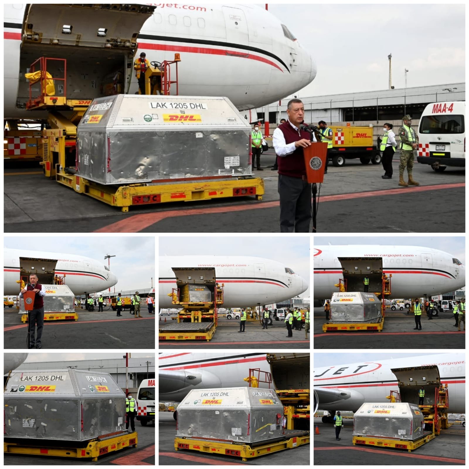 Pfizer-BioNTech, en el trigésimo octavo embarque. Arribó a las 10.27 h en el vuelo CVG MEX 952, procedente de Cincinnati, Estados Unidos, a la terminal 1 vuelo del Aeropuerto Internacional de la Ciudad de México (AICM) “Benito Juárez”.