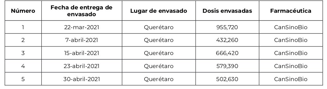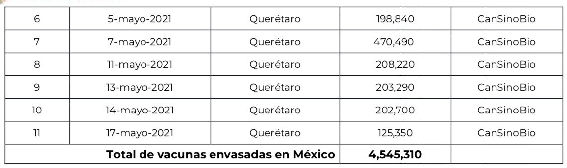 México ha recibido 36 millones 217 mil 355 dosis de vacunas envasadas Pfizer- BioNTech, AstraZeneca, Sinovac, Centro Nacional de Investigación de Epidemiología y Microbiología Gamaleya, así como CanSino Biologics. Asimismo, en nuestro país, el laboratorio Drugmex ha envasado cuatro millones 545 mil 310 dosis de CanSino Biologics, lo que hace un total de 40 millones 762 mil 665 dosis.
