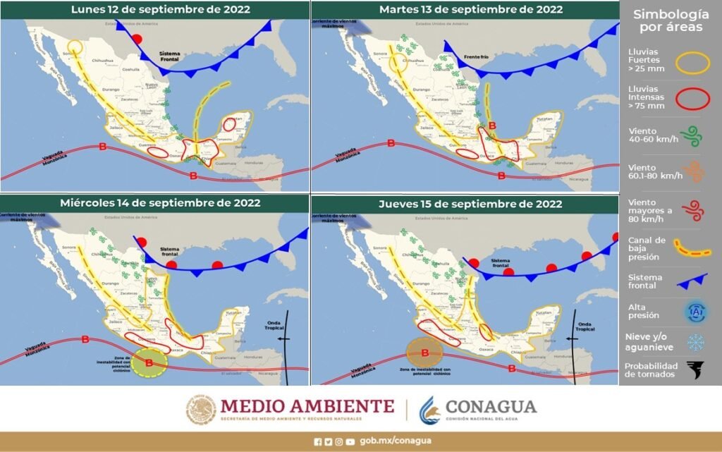 La Comisión Estatal del Agua (Ceagua) replica la información que emite el Servicio Meteorológico Nacional (SMN), referente a las temperaturas para la segunda semana del mes de septiembre de 2022, en el que se prevén intervalos de chubascos con lluvias puntuales fuertes de 25 a 50 mm.