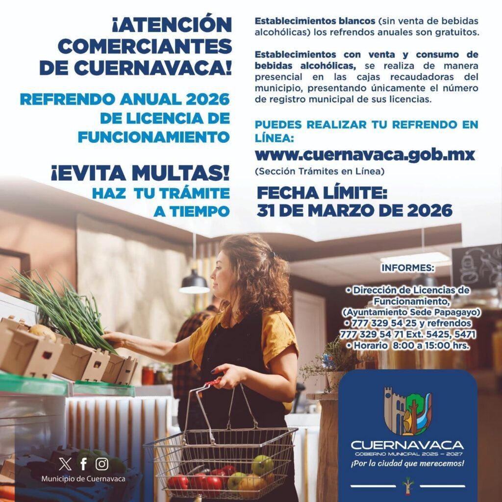 Con el objetivo de fortalecer el orden comercial y brindar certeza a las actividades económicas de la ciudad, el Ayuntamiento de Cuernavaca, a través de la Dirección de Licencias de Funcionamiento de la Secretaría de Desarrollo Económico y Turismo (SDEyT), invita a las y los comerciantes a cumplir con el refrendo de sus licencias de funcionamiento correspondiente al ejercicio fiscal 2026 antes del 31 de marzo.