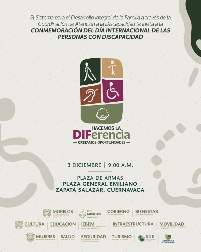 El Sistema para el Desarrollo Integral de la Familia del Estado de Morelos (SEDIF), a través de la Coordinación de Atención a la Discapacidad, invita a todas las personas a participar el 03 de diciembre de 2025 en las actividades conmemorativas con motivo del Día Internacional de las Personas con Discapacidad: “Hacemos la DIFerencia, CREEamos oportunidades”.