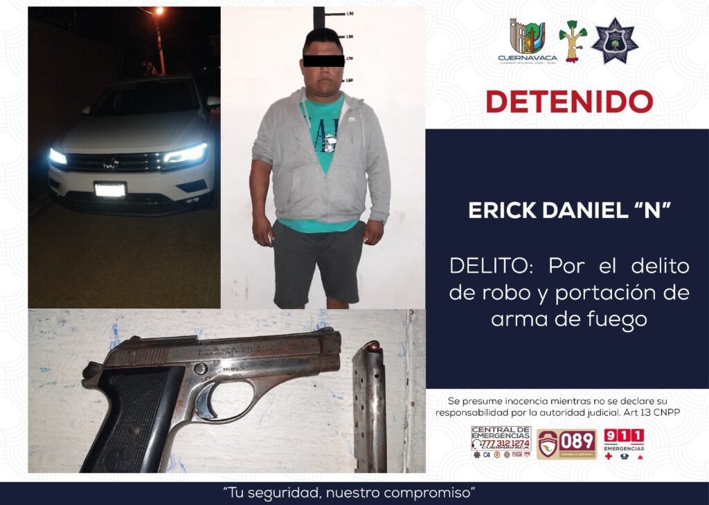 Elementos de seguridad pública de la Secretaría de Protección y Auxilio Ciudadano de Cuernavaca (SEPRAC) realizaron la noche de este miércoles la detención de dos personas por el presunto delito de robo y portación de arma de fuego, así como por la posesión de un vehículo con reporte de robo vigente y delitos contra la salud, impidiendo además un intento de robo.
