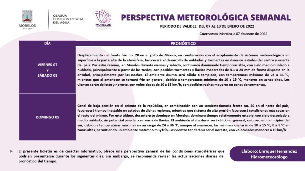 La Comisión Estatal del Agua (Ceagua) informa que para el segundo fin de semana del año nuevo se pronostica tiempo variable con cielo medio nublado a nublado, mañanas frescas y tardes cálidas, con temperaturas máximas de 36°C sobre territorio morelense.